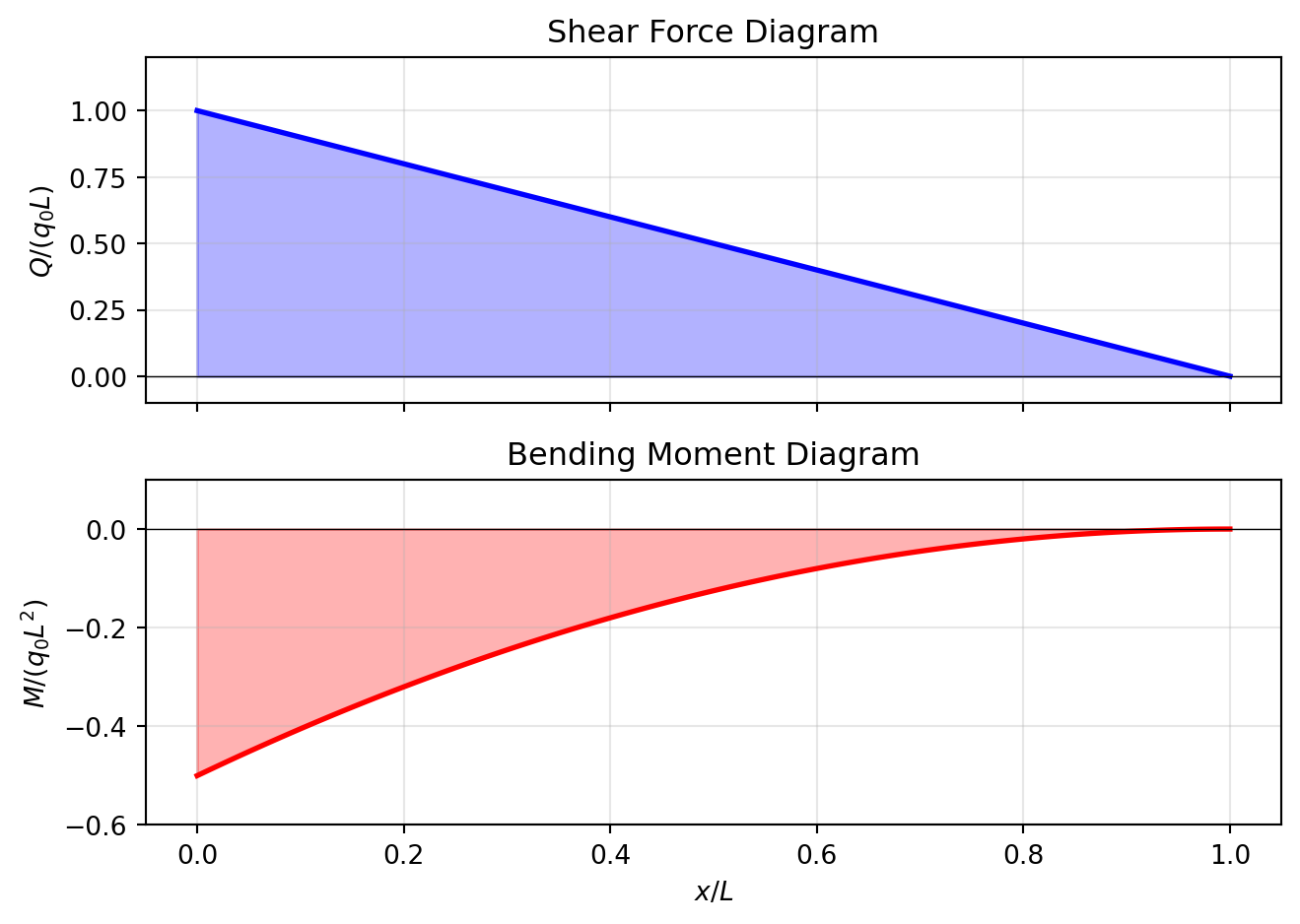 import numpy as npimport matplotlib.pyplot as plt# Normalized coordinates (x/L) and normalized load (q0 = 1, L = 1)x = np.linspace(0, 1, 100)# Shear force: Q(x) = q0 * L * (1 - x/L) = q0*L * (1 - xi) where xi = x/L# Normalized: Q / (q0*L)Q_normalized =1- x# Bending moment: M(x) = -q0/2 * (L - x)^2 = -q0*L^2/2 * (1 - x/L)^2# Normalized: M / (q0*L^2)M_normalized =-0.5* (1- x)**2fig, (ax1, ax2) = plt.subplots(2, 1, figsize=(7, 5), sharex=True)# Shear force diagramax1.fill_between(x, 0, Q_normalized, alpha=0.3, color='blue')ax1.plot(x, Q_normalized, 'b-', linewidth=2)ax1.axhline(y=0, color='k', linewidth=0.5)ax1.set_ylabel(r'$Q / (q_0 L)$')ax1.set_title('Shear Force Diagram')ax1.set_ylim(-0.1, 1.2)ax1.grid(True, alpha=0.3)# Bending moment diagramax2.fill_between(x, 0, M_normalized, alpha=0.3, color='red')ax2.plot(x, M_normalized, 'r-', linewidth=2)ax2.axhline(y=0, color='k', linewidth=0.5)ax2.set_xlabel(r'$x / L$')ax2.set_ylabel(r'$M / (q_0 L^2)$')ax2.set_title('Bending Moment Diagram')ax2.set_ylim(-0.6, 0.1)ax2.grid(True, alpha=0.3)plt.tight_layout()plt.show()