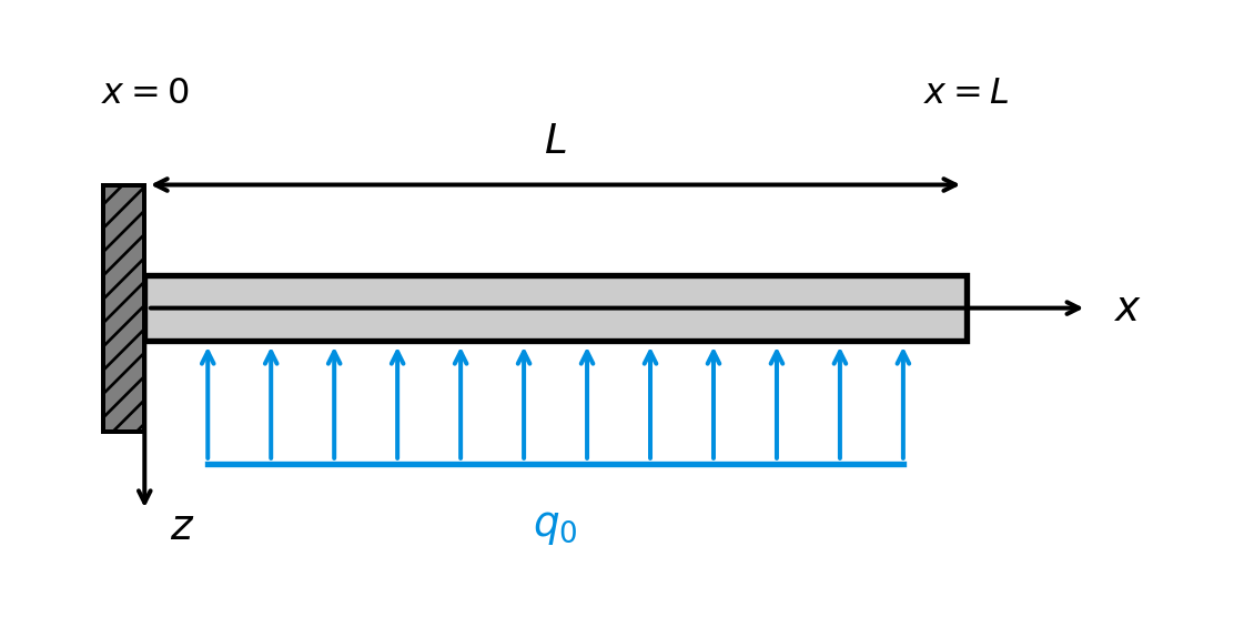 Figure 6: Cantilever beam with fixed support at the left end and uniform distributed load \(q_0\).