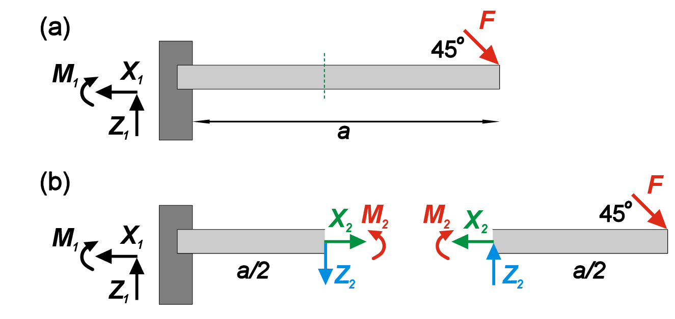 For illustration, let’s consider an example of a beam with length \(a\), that is fixed on the left end and subjected to an inclined point load \(F\) on the right end (Figure 3). We search for the reaction forces as well as internal forces in the middle point of the beam. Simply balancing forces and moments we get \[\begin{aligned} X_1&=F/\sqrt{2} \\ Z_1&=F/\sqrt{2} \\ M_1&=-Fa/\sqrt{2} \end{aligned}\] To find the internal forces and moments at the middle of the beam, we need to cut the beam into two fragments, introduce two reaction forces \(X_2\) and \(Z_2\) and one reaction moment \(M_2\) to preserve equilibrium. Finally, by balancing the forces for both fragments we get \[\begin{aligned} X_2&=F/\sqrt{2} \\ Z_2&=F/\sqrt{2} \\ M_2&=-\frac {Fa}{2\sqrt{2}} \end{aligned} \tag{1}\]
