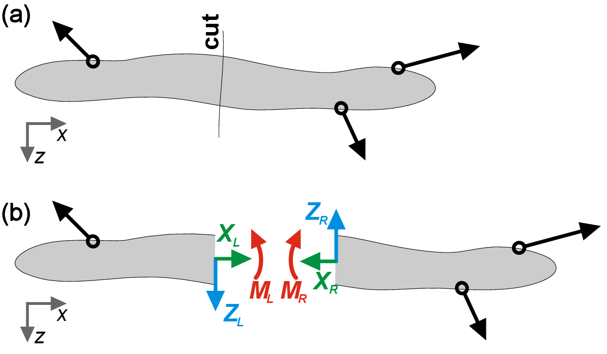 Figure 1: Internal forces at a hypothetical cut through the body. Note that forces and moment on left and right sides of the cut compensate each other to maintain equilibrium.