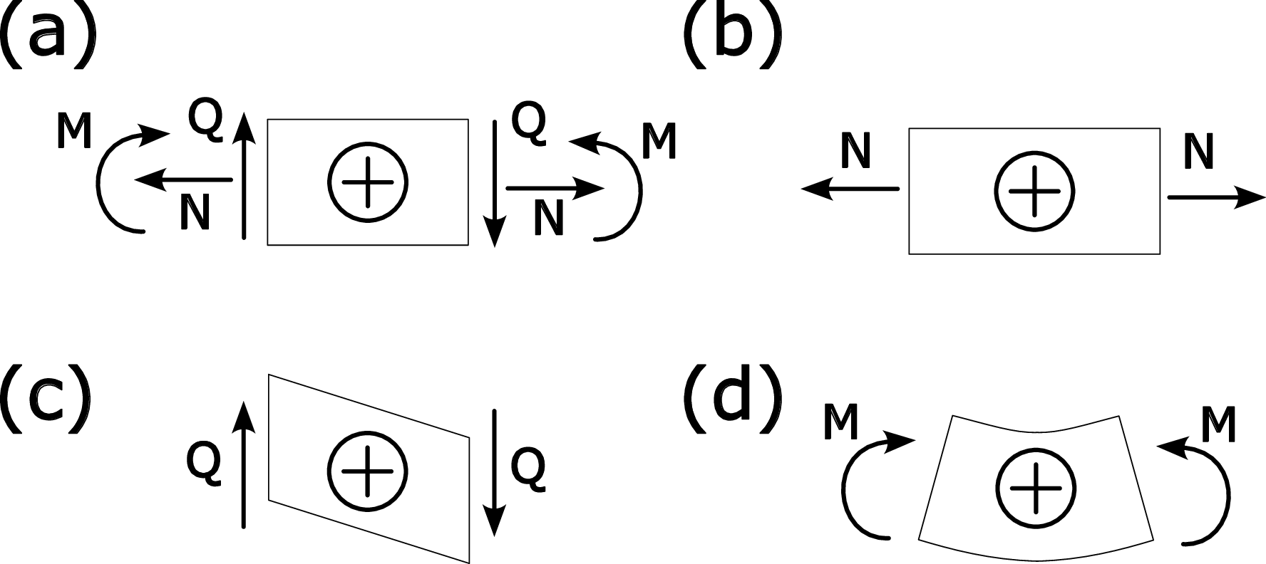 Figure 2: (a) Sign conventions for normal force \(N\), shear force \(Q\) and bending moment \(M\). Deformations caused by (b) normal force, (c) shear force and (d) bending moment.