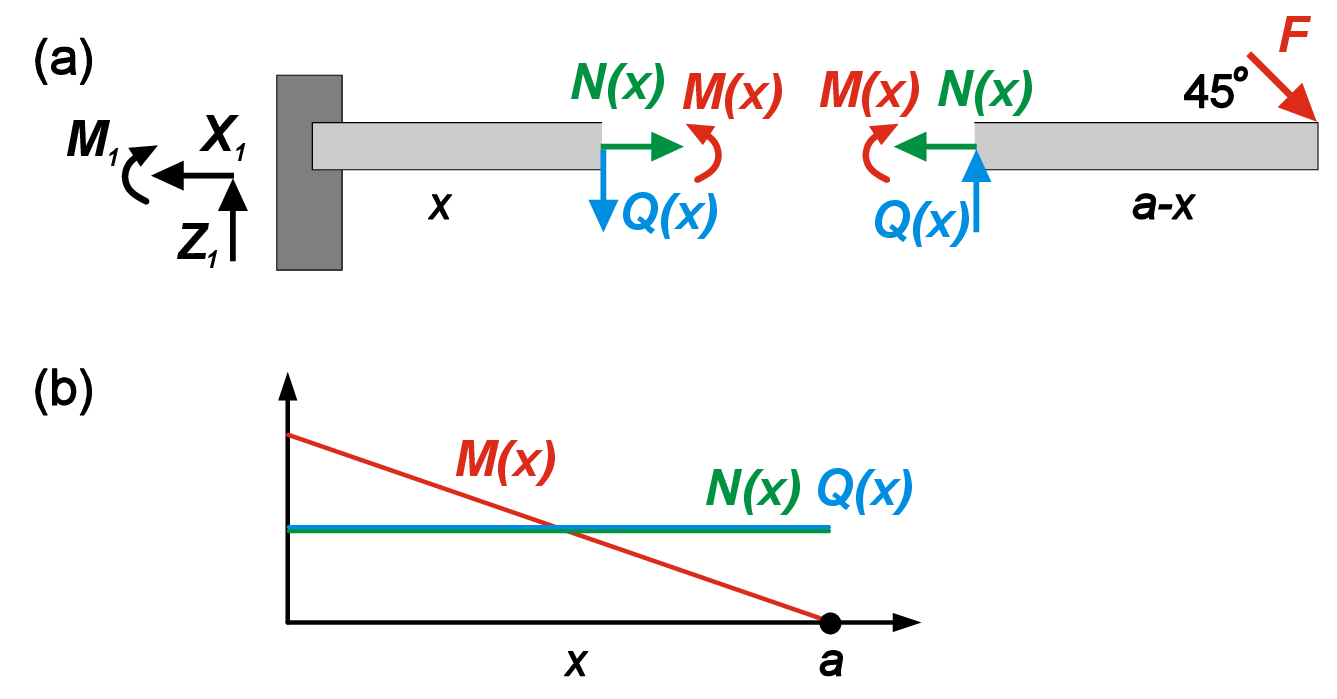 Let us consider a cut located at the distance \(x\) from the left hinge/wall (Figure 4). By balancing forces and moments acting on the left and right fragments, it is easy to show that \[\begin{aligned} N(x)&=F/\sqrt{2} \\ Q(x)&=F/\sqrt{2} \\ M(x)&=-\frac {F(a-x)}{\sqrt{2}} \end{aligned} \tag{2}\] Therefore, both longitudinal and shear forces are constant functions of the coordinate \(x\), while moment linearly decreases with an increase in \(x\).