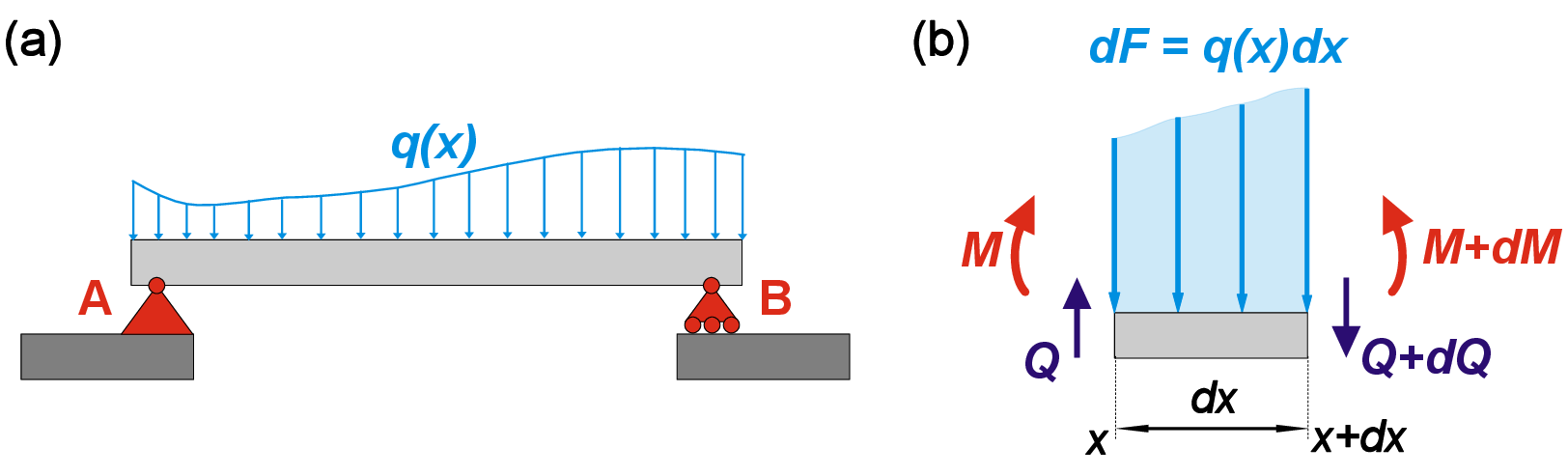 Figure 5: (a) A beam subjected to distributed load. (b) Infinitesimal fragment of beam and corresponding forces.